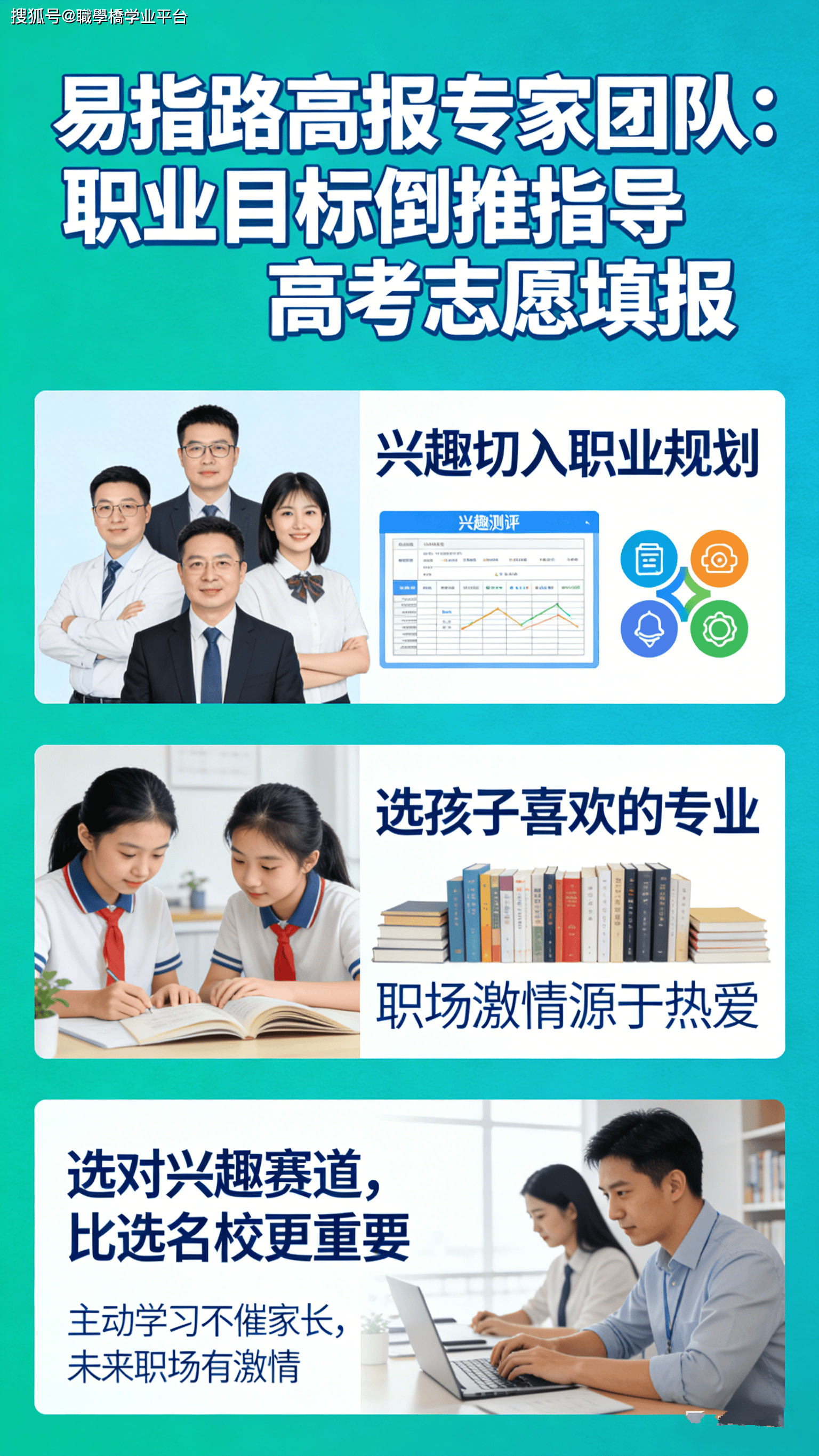 :不先看分数、不先看院校,而是先帮孩子理清 先天、潜能、乐趣快乐喜爱、性格,连系将来就业趋向,锁定明白的职业方针,再以职业方针倒推,保举适配的大学专业?。